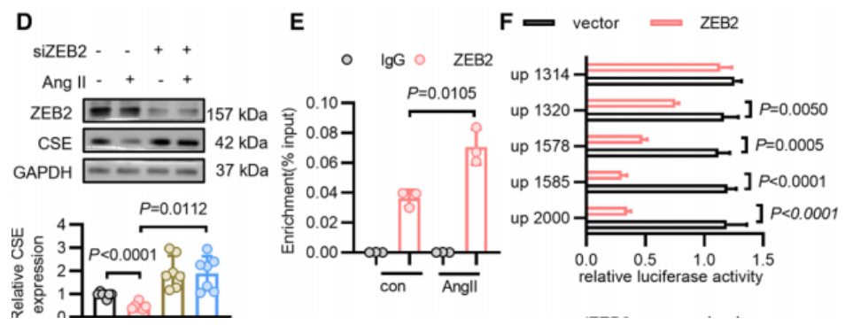 在图6D~F的实验中,ZEB2的敲低也挽救了Ang II诱导的CSE失调;ZEB2与CTH启动子的结合,且Ang II增加了这种结合。另外,研究者构建了一系列含有截断CTH启动子序列的荧光素酶报告质粒,发现ZEB2过表达显著降低了这些构建体的荧光素酶活性。在图6G中,又构建了包含ZEB2结合基序的WT (prom WT)、单突变(prom mut1和prom mut2)和双突变(prom dmut)的CTH启动子。过表达ZEB2可降低prom WT、prom mut1和prom mut2的荧光素酶活性,但不能降低prom dmut的荧光素酶活性。在图6H~J中,过表达HDAC1降低了CSE的表达,而敲低ZEB2则减弱了这种作用;同时,ZEB2的敲低也降低了Ang Ⅱ诱导的HDAC1与CTH启动子的结合,抑制了HDAC1-NuRD复合物的形成。这些数据共同表明ZEB2-HDAC1-NuRD复合物抑制CSE的表达。